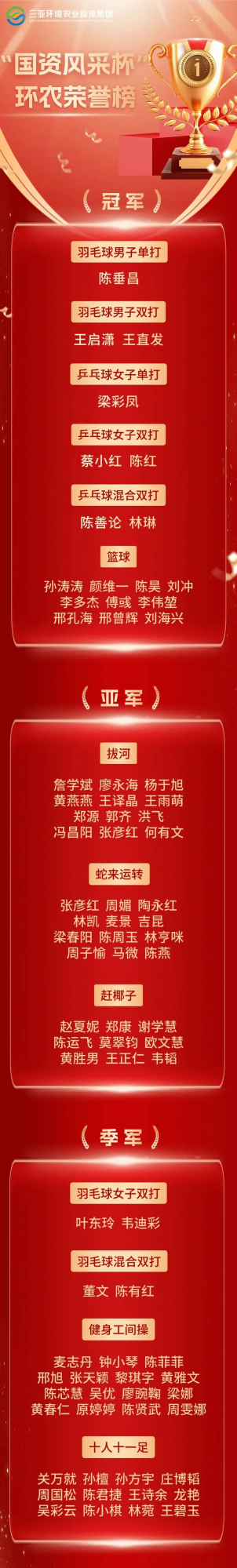 榮耀加身,未來可期。三亞環(huán)農(nóng)集團將以此次賽事為契機,把賽場上的拼搏精神轉(zhuǎn)化為推動工作的強大動力,凝心聚力、銳意進取,在深耕海南自貿(mào)港相關(guān)產(chǎn)業(yè)、助力地方經(jīng)濟發(fā)展的道路上續(xù)寫新的篇章!